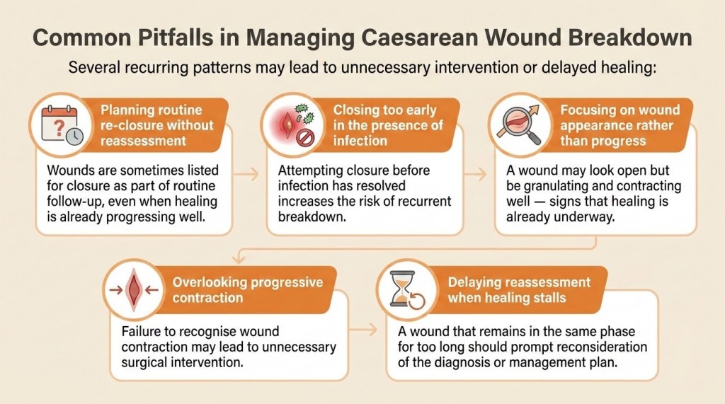 It does not cover prevention, dressing techniques, antibiotic use, or management of deep fascial dehiscence. The emphasis here is on recognising wound progress and deciding whether intervention is required.