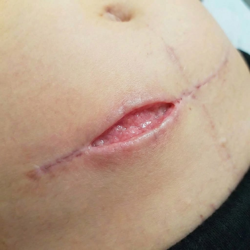 If there is concern about fascial involvement, urgent surgical review is required. This discussion applies only to superficial wound breakdown with intact rectus fascia.